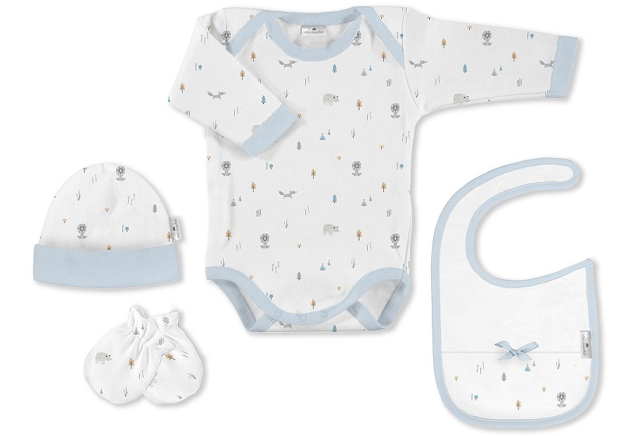 Το πρώτο σετ είναι ένα μέγεθος, είναι κατασκευασμένο από 100% οικολογικό βαμβάκι. Και αποτελείται από ένα καπέλο, δύο γάντια, μια σαλιάρα, ένα μικρό μπλουζάκι και παντελονάκι με κλειστά πόδια, βασικά απαραίτητα και εύκολα στη χρήση. Το σετ ανήκει στη συλλογή παιδικής φροντίδας Don Algodon και έχει μια πρωτότυπη και χαρούμενη εκτύπωση.
