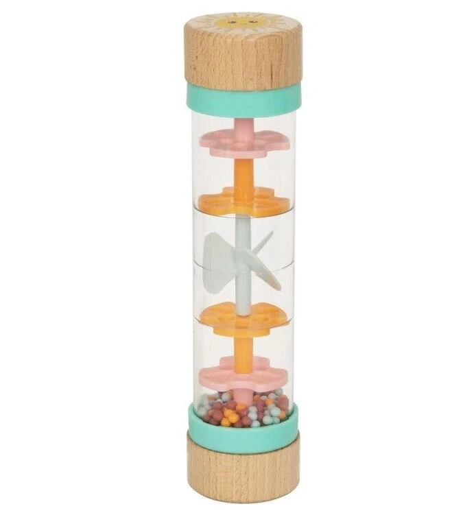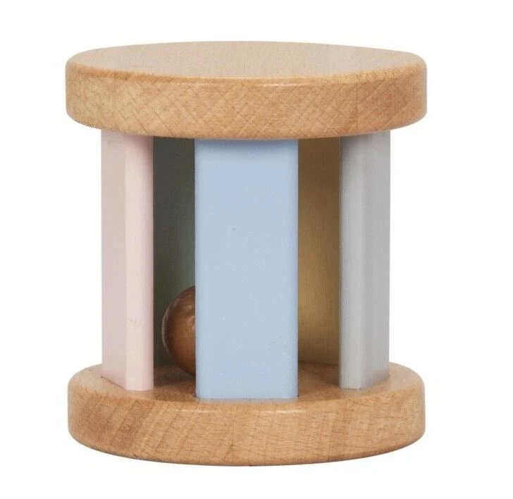 Ο ξύλινος κύλινδρος σε παστέλ χρώμα κρύβει μέσα του μια ξύλινη μπάλα, η οποία κάνει έναν ευχάριστο ήχο κάθε φορά που μετακινείτε ή τον κουνάτε.