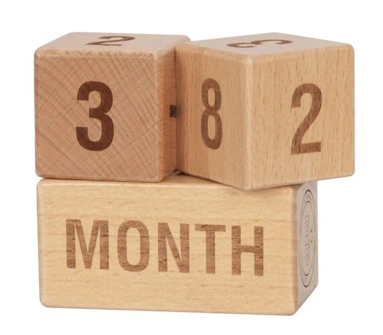 Το ξύλινο μπλοκ και οι κύβοι με αριθμούς και λέξεις για την εβδομάδα, το μήνα και το έτος είναι ένα ενδιαφέρον παιχνίδι για εξερεύνηση, μια όμορφη διακόσμηση και ένα εργαλείο για την αποτύπωση σημαντικών στιγμών της ζωής.