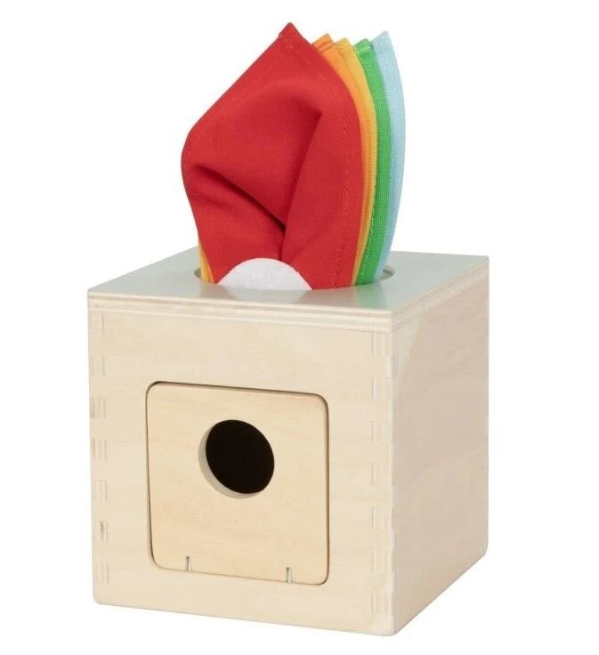 Ένα ξύλινο κουτί με ένα σετ υφασμάτινα μαντήλια σε όμορφα χρώματα θα διασκεδάσει τα παιδιά και θα βελτιώσει ακόμα περισσότερο τις δεξιότητές τους.