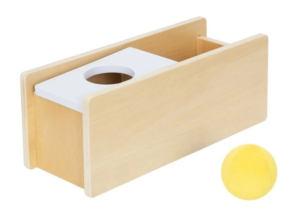 Ένα ξύλινο κουτί με τρύπα εισάγει τα παιδιά στις ιδιότητες ενός αντικειμένου, σε αυτήν την περίπτωση μιας μαλακής μπάλας.