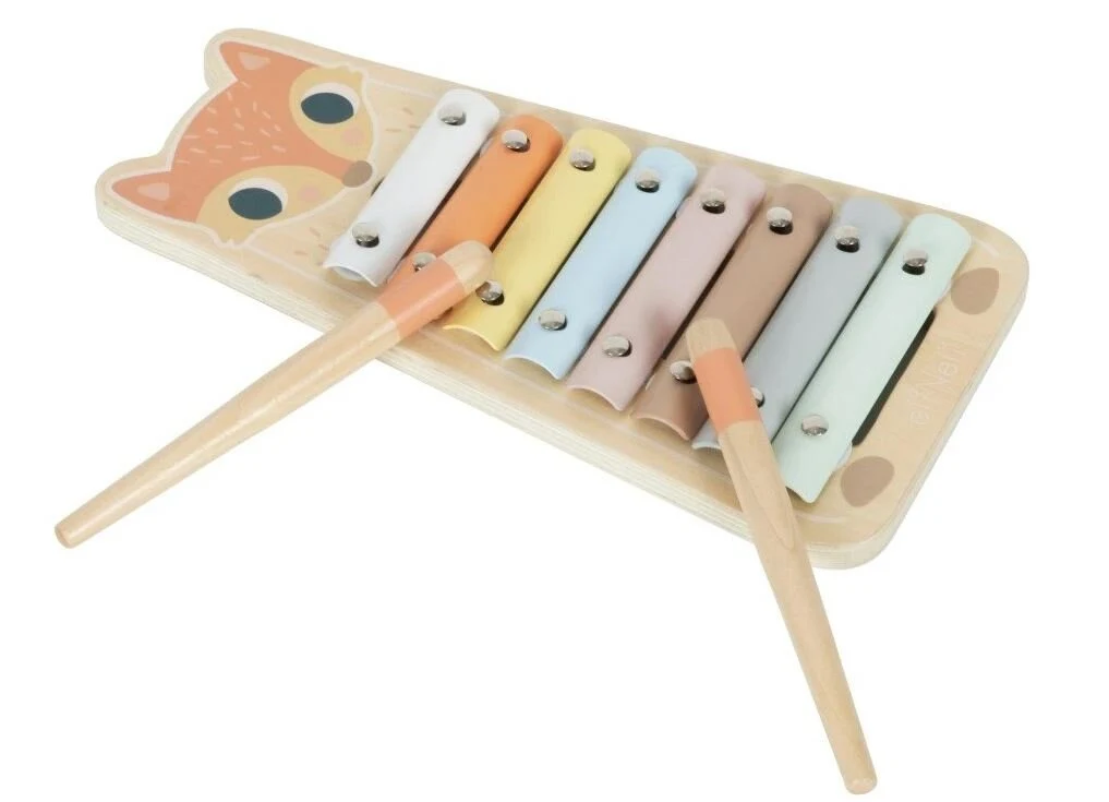 Το ξυλόφωνο για παιδιά είναι ένα από τα κλασικά παιχνίδια που δεν πρέπει να λείπουν από κανένα παιδικό δωμάτιο, γωνιά παιχνιδιού ή νηπιαγωγείο. Αυτό το μουσικό παιχνίδι σε σχήμα χαριτωμένου φύλλου παρακινεί τα παιδιά να παίξουν και είναι βέβαιο ότι θα ξυπνήσει στα παιδιά μια αγάπη για τη μουσική που μπορεί να εξελιχθεί σε πάθος ζωής. Χάρη στα ξύλινα σφυριά, τα οποία αποτελούν μέρος του ξύλινου ξυλόφωνου, τα παιδιά μπορούν να χτυπήσουν τα χρωματιστά πιάτα και να διερευνήσουν τι ήχους κάνει κάθε χρωματιστό πιάτο. Θα μάθουν να αναγνωρίζουν χρώματα, να διακρίνουν διαφορετικούς ήχους. Ουδέτερο παστέλ, κυρίως φυσικά, χρώματα και κόκκινη αλεπού δίνουν στο ξυλόφωνο μια ελκυστική εμφάνιση και πρωτοτυπία. Ενώ παίζουν ξυλόφωνο, τα παιδιά βελτιώνουν τις λεπτές κινητικές τους δεξιότητες και άλλες δεξιότητες και διεγείρουν τις αισθήσεις τους.
