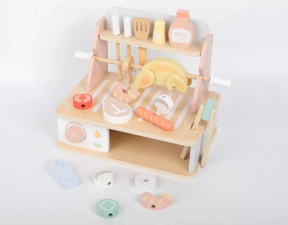 - Ένα εκπαιδευτικό παιχνίδι – ένα ξύλινο σετ μπάρμπεκιου θα επιτρέψει στα παιδιά να δοκιμάσουν να ετοιμάσουν φαγητό στη σχάρα με έναν ασφαλή, φιλικό προς τα παιδιά τρόπο.