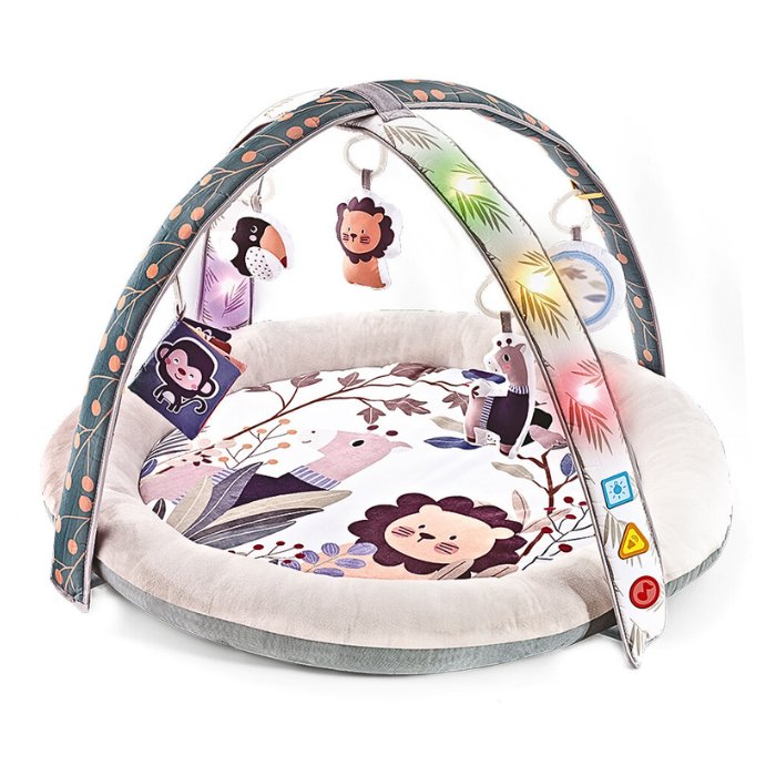 Πολυχρηστικό γυμναστήριο-φωλίτσα Zoo της Bebe Stars για βρέφη 0+, με χαλάκι δραστηριοτήτων, μουσική, φώτα και 5 αποσπώμενα παιχνίδια για ανάπτυξη αισθήσεων και κινητικών δεξιοτήτων.