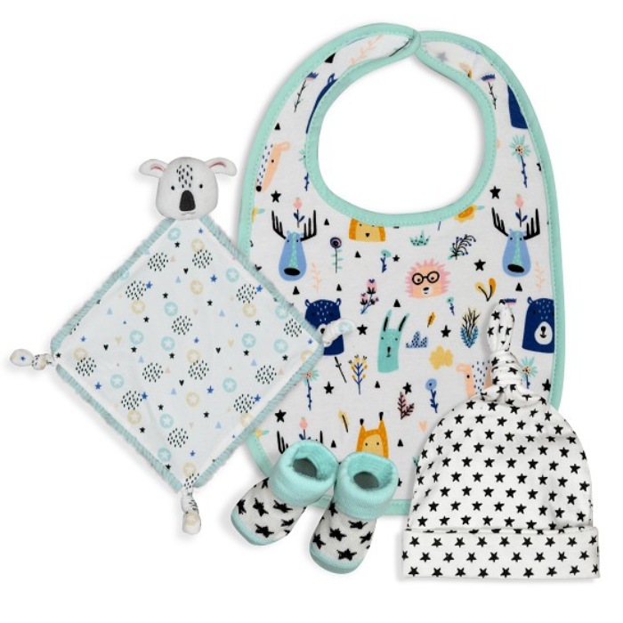Όμορφο σετ δώρου για νεογέννητο που περιλαμβάνει σκουφάκι, σαλιάρα,νάνι και καλτσάκια. Από απαλά υλικά, σε χαρούμενο σχέδιο και κομψό κουτί δώρου ιδανικό για τα πρώτα του βήματα στη ζωή.