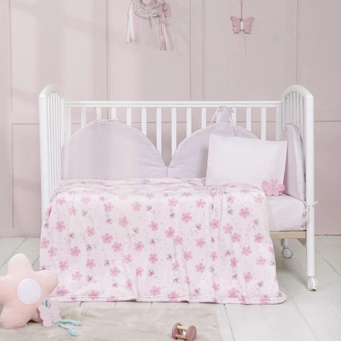 Βρεφική κουβέρτα Bloomie NIMA Flannel 100% Polyester, εξαιρετικά απαλή και ζεστή, με ροζ floral σχέδιο για άνετο και ήρεμο ύπνο.