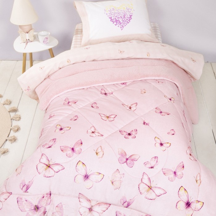 Σε γλυκές αποχρώσεις του ροζ και του λιλά, αυτό το κουβερτοπάπλωμα είναι ιδανικό για κάθε μικρή πριγκίπισσα που αγαπά τη φαντασία και τη ζεστασιά.