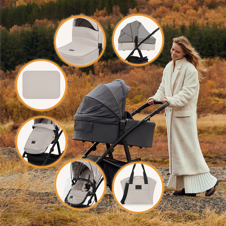 Το σετ περιλαμβάνει χρήσιμα αξεσουάρ για κάθε καιρό: κουνουπιέρα, ποδόκασος πορτ-μπεμπέ, ποδόσακος καροτσιού, τσάντα, κάλυμμα βροχής, αλλαξιέρα.