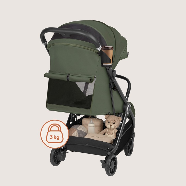 Το εύκολα προσβάσιμο, μεγάλο καλάθι χωράει ψώνια, ρουχαλάκια και παιχνίδια (μέγιστο βάρος έως 3 kg), ενώ η ποτηροθήκη – που τοποθετείται σε οποιαδήποτε πλευρά – θα κρατήσει τον αγαπημένο σας καφέ κατά τη διάρκεια της βόλτας.