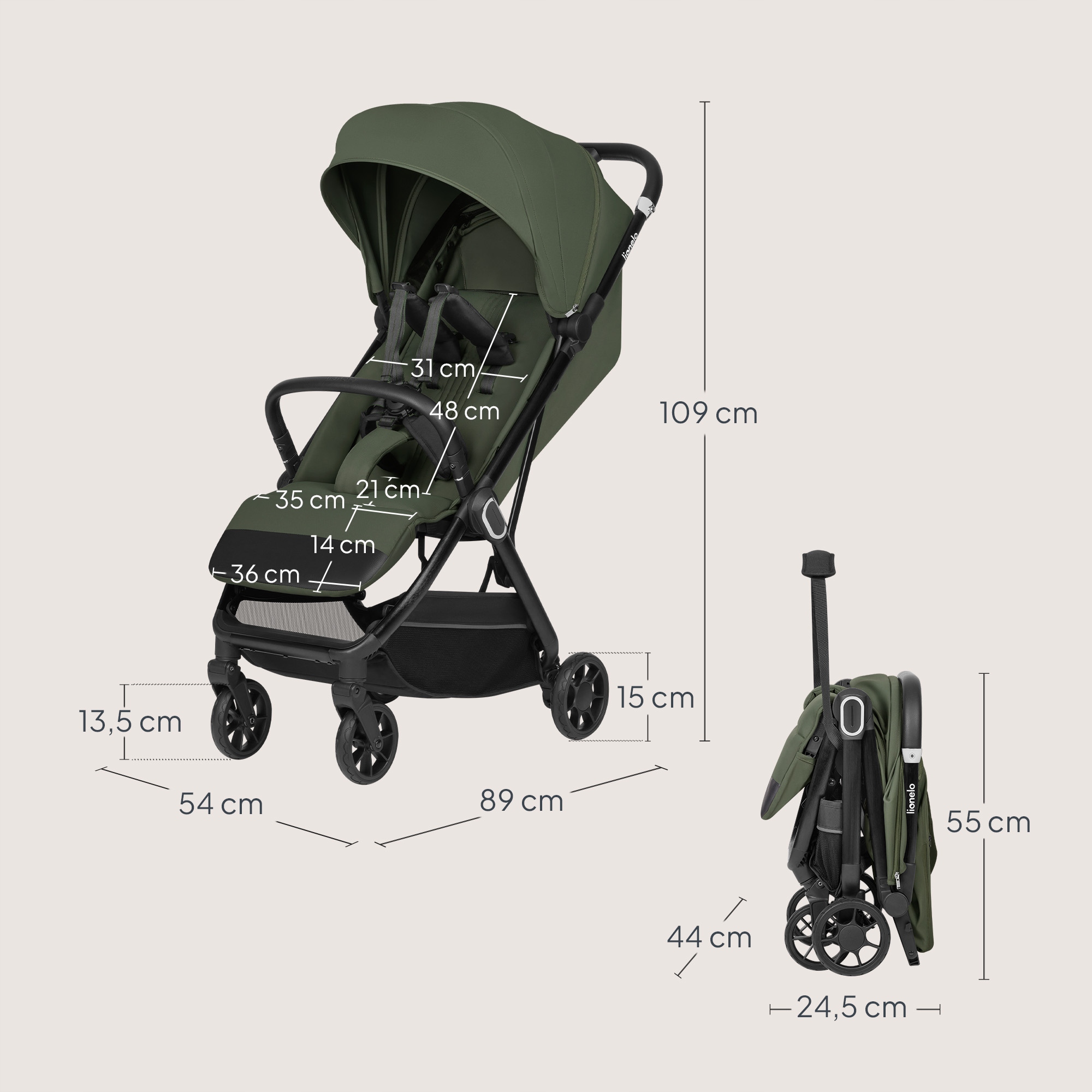 Το καρότσι Lionelo Bess ζυγίζει μόνο 7,5 κιλά και διπλώνει γρήγορα σε συμπαγές μέγεθος. Είναι ιδανικό για αεροπλάνα ή μικρά αυτοκίνητα. Ελαφρύ, συμπαγές και έτοιμο για κάθε περιπέτεια – από μια καθημερινή βόλτα μέχρι ένα μακρύ ταξίδι.