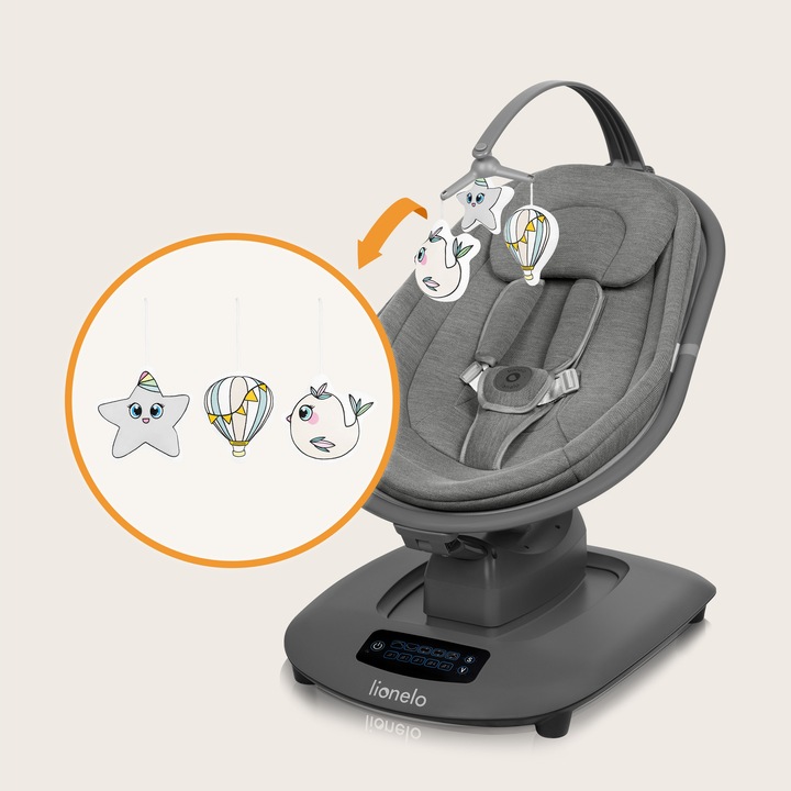 Το ρηλαξ παρέχει στο μωρό σας ένα ασφαλές και άνετο μέρος για να ξεκουραστεί. Βοηθά το μωρό σας να ηρεμήσει και, χάρη στην παρουσία μιας μπάρας παιχνιδιών με 3 παιχνίδια, ενθαρρύνει το μωρό σας να εξασκηθεί στο να σηκώνει τα χέρια του. Η συσκευή μπορεί να χειριστεί εξ αποστάσεως – χρησιμοποιώντας το παρεχόμενο τηλεχειριστήριο ή μέσω του πίνακα ελέγχου αφής.