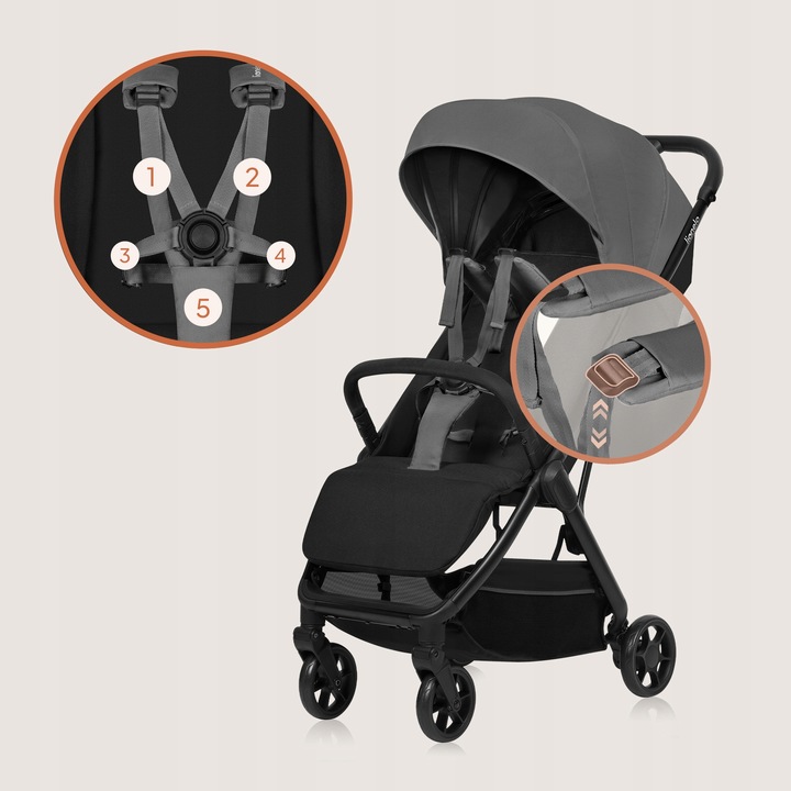 Για μέγιστη ασφάλεια, το καρότσι είναι εξοπλισμένο με ζώνες ασφαλείας 5 σημείων με μαλακά μαξιλαράκια που προστατεύουν το ευαίσθητο δέρμα του μωρού σας από την τριβή. Το ρυθμιζόμενο μήκος της ζώνης επιτρέπει την τέλεια εφαρμογή στο ύψος του μωρού σας, ενώ η εύχρηστη αγκράφα επιτρέπει γρήγορο και εύκολο δέσιμο.