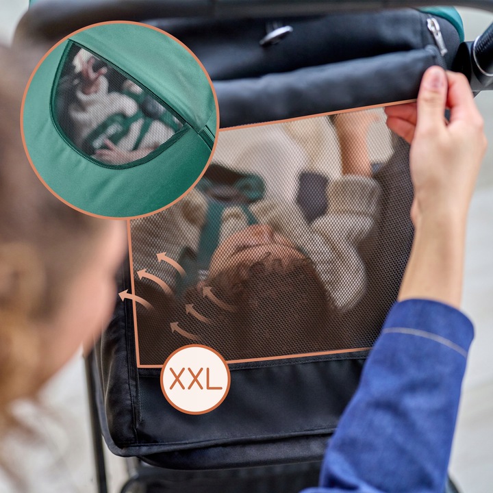 Στην XXL τέντα, το παιδί (ακόμα και το μεγαλύτερο) έχει άφθονο χώρο. Η τέντα διαθέτει ένα επιπλέον, αναδιπλούμενο πάνελ με φερμουάρ, καθώς και ένα παράθυρο εξαερισμού και μια τέντα ηλίου