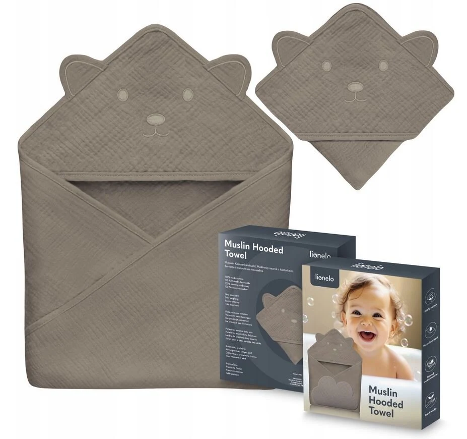 Το Lionelo Muslin Μπουρνούζι κάπα είναι μια 100% μουσελίνα, απαλή και ελαφριά παιδική πετσέτα με κουκούλα που μπορεί να χρησιμοποιηθεί ως πετσέτα μπάνιου.