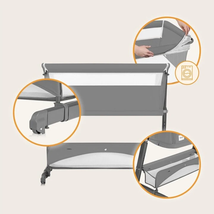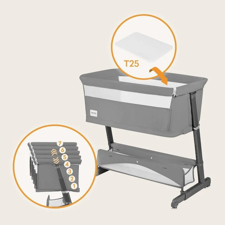 Η ρύθμιση μήκους ποδιού σε 7 θέσεις σάς επιτρέπει να το προσαρμόσετε στο ύψος του κρεβατιού των γονιών σας. Οι ζώνες σταθεροποίησης αυξάνουν την ασφάλεια.
