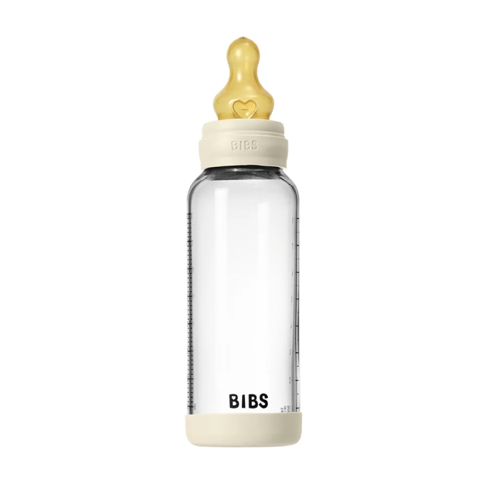Σετ γυάλινο μπιμπερό BIBS 240ml Ivory με θηλή από φυσικό καουτσούκ latex και αντικολική βαλβίδα, για φυσική και άνετη σίτιση από 0+ μηνών.