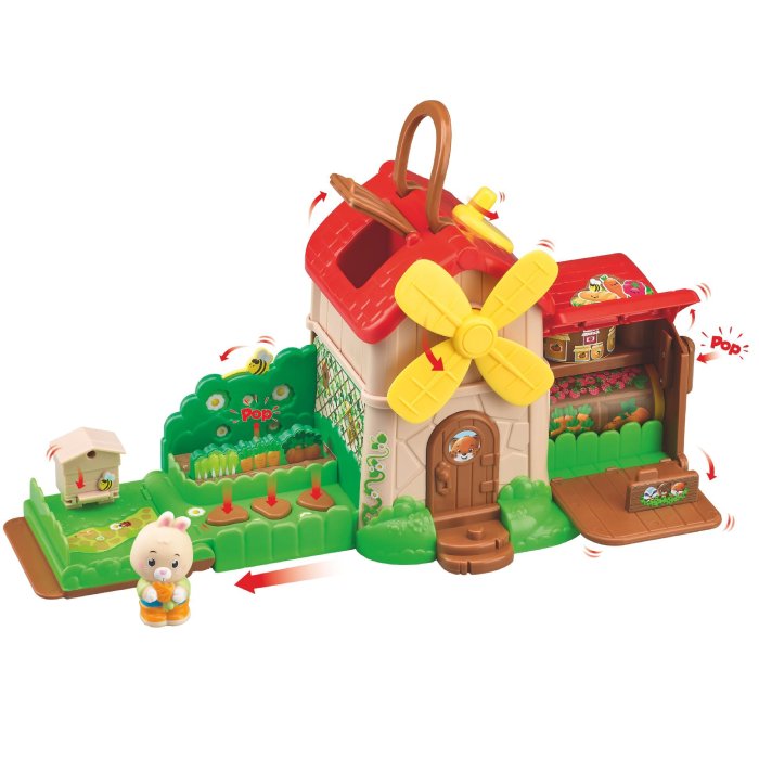 Τον μύλο που γυρίζει με την ειδική μανιβέλα στην οροφή μια κίνηση που γεμίζει ενθουσιασμό κάθε μικρό χεράκι, τον λαχανόκηπο POP! είναι γεμάτος φρούτα & λαχανικά που “ξεπετάγονται” με ένα απλό πάτημα δίπλα στον κήπο το μελισσάκι κινείται πέρα-δώθε και παρακολουθεί τον κήπο, ενώ το μελίσσι κρύβει μέλι και μέλισσες.