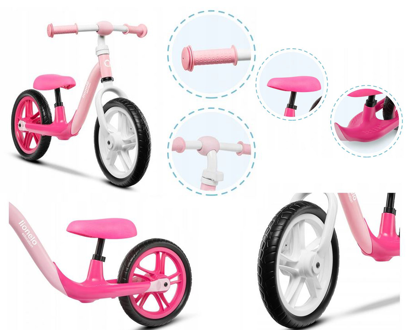 To Alex Pink ποδήλατο ισορροπίας της εταιρείας Lionelo αποτελείται από έναν μοναδικό ανθεκτικό πλαίσιο κατασκευασμένο από υψηλής ποιότητας κράματα μετάλλων και ζυγίζει 3.3 κιλά. Συμβάλλει στην ανάπτυξη της αίσθησης της ισορροπίας. Μεγαλώνει μαζί με το παιδί! Συνδυάζει άνεση με ασφάλεια!