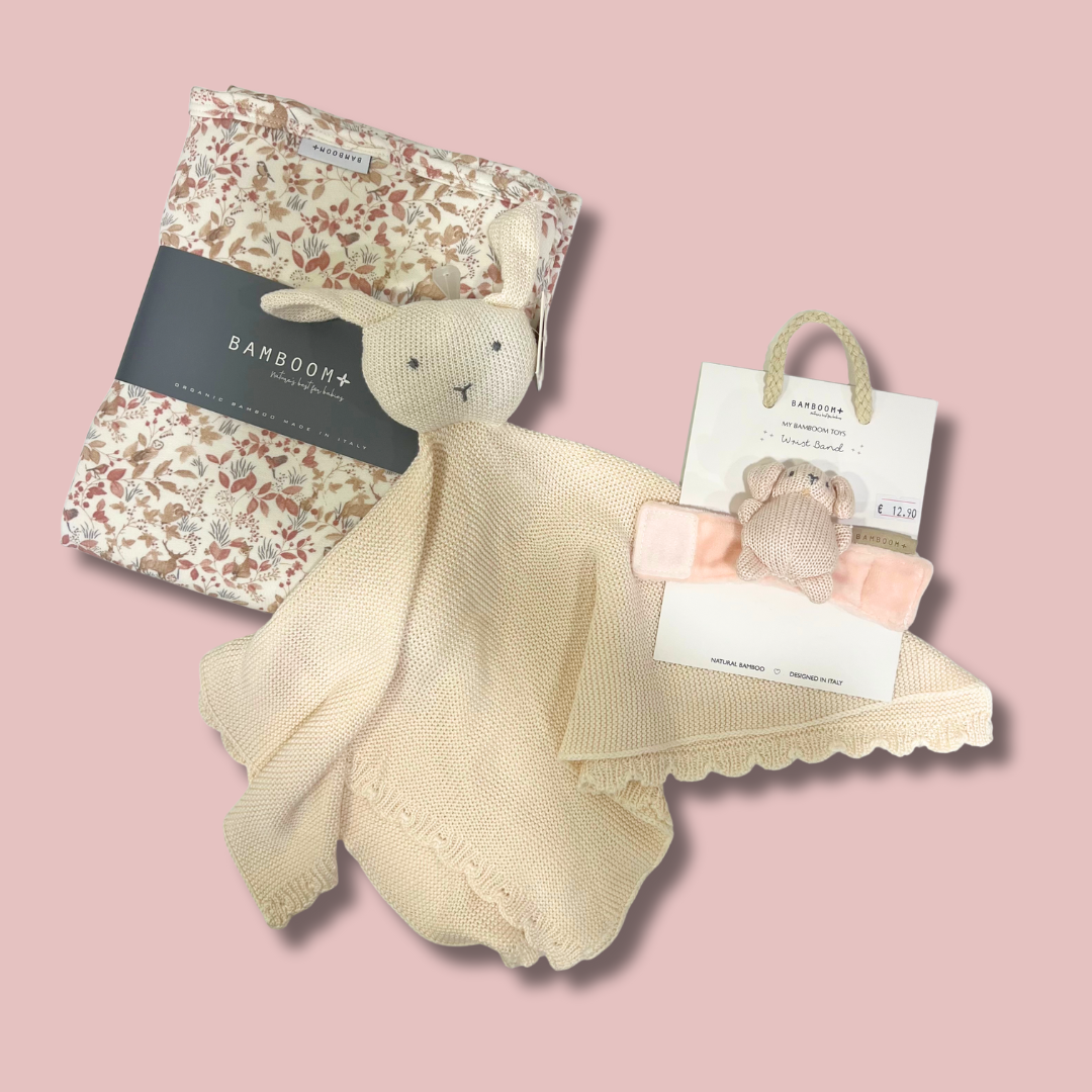 Σετ Δώρου για Κορίτσι Νάνι μωρού, πάνα αγκαλιάς και πλεκτό βραχιόλι Κουνελάκι BAMBOOM