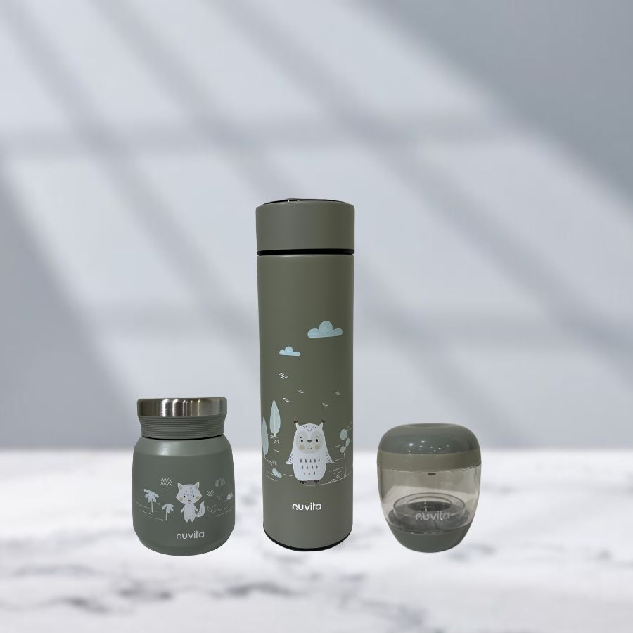 Πρακτικό και κομψό σετ δώρου NUVITA με θερμός νερού, θερμός φαγητού και αποστειρωτή πιπίλας, ιδανικό για βόλτες και ταξίδια. Διατηρεί τη σωστή θερμοκρασία, εξασφαλίζει υγιεινή και προσφέρει άνεση σε κάθε γεύμα του μωρού.