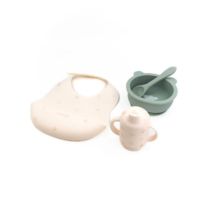 Το σετ περιλαμβάνει σαλιάρα σιλικόνης με τσεπάκι συλλογής τροφής, μπολ με βεντούζα και κουταλάκι, καθώς και ποτηράκι, προσφέροντας τον ιδανικό σύμμαχο στο ταξίδι της ανεξαρτησίας του μικρού σας στο τραπέζι.
