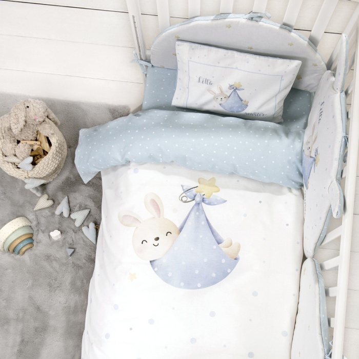 Βρεφικό σετ βαμβακερών σεντονιών Little Mister με μαξιλαροθήκη, 100% cotton απαλό και ανθεκτικό. Χαριτωμένο πάνελ σχέδιο με νεογέννητο λαγουδάκι σε απαλό γαλάζιο και λευκό για τρυφερό και ήρεμο ύπνο.