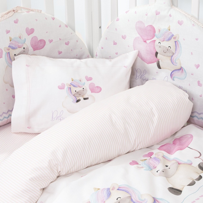 Βρεφικό σετ βαμβακερών σεντονιών Luni Uni με μαξιλαροθήκη, 100% cotton απαλό και ανθεκτικό. Παραμυθένιο σχέδιο με μονόκερους και παστέλ αποχρώσεις για ονειρεμένο ύπνο.