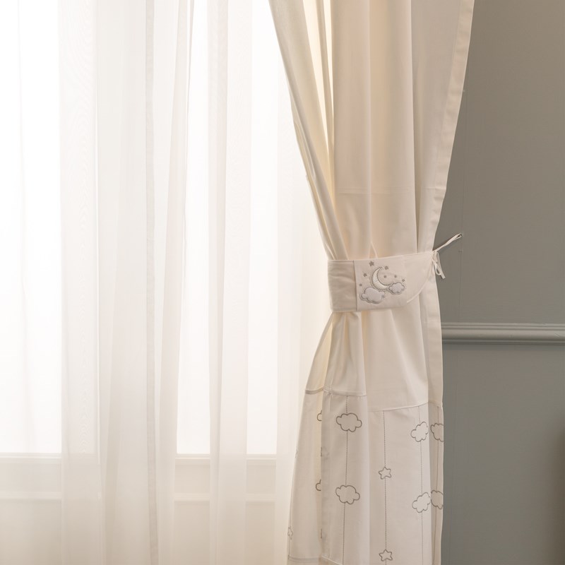 Κουρτίνα και ασορτί δέστρα με απλικέ κέντημα για ένα ονειρικό παιδικό δωμάτιο.