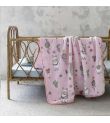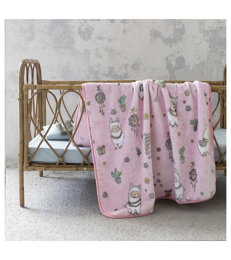 Βελουτέ κουβέρτα κούνιας ΝIMA Happy Alpaca σε ζεστό ροζ χρώμα με όμορφο τυπωτό μοτίβο με ζωάκια και λουλούδια σε πράσινες και κίτρινες αποχρώσεις .