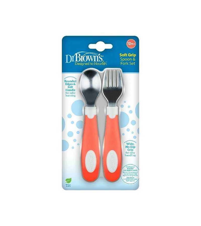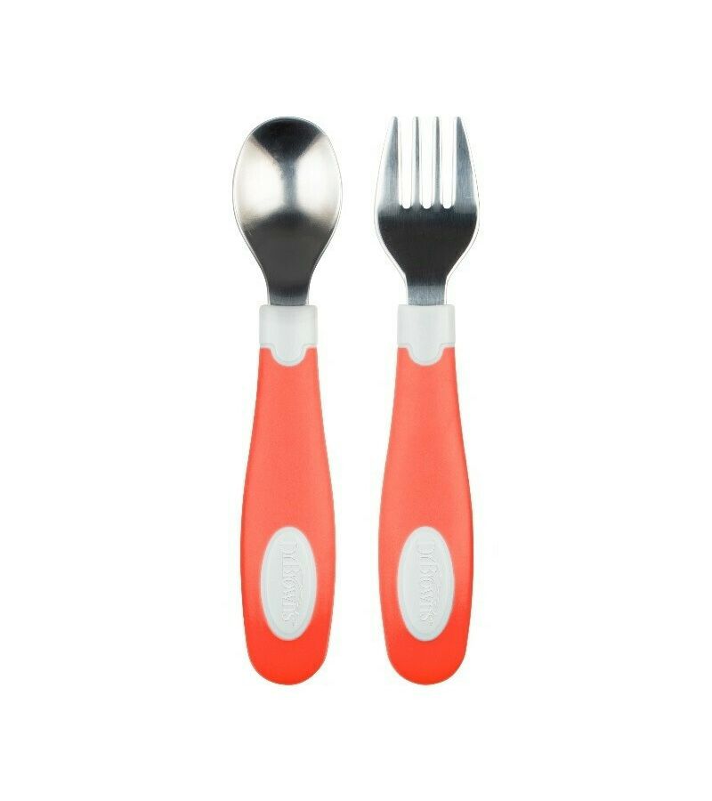 DrBrownʼs Σετ Κουτάλι Με Πιρούνι Μεταλλικά σε κοραλί χρώμα.