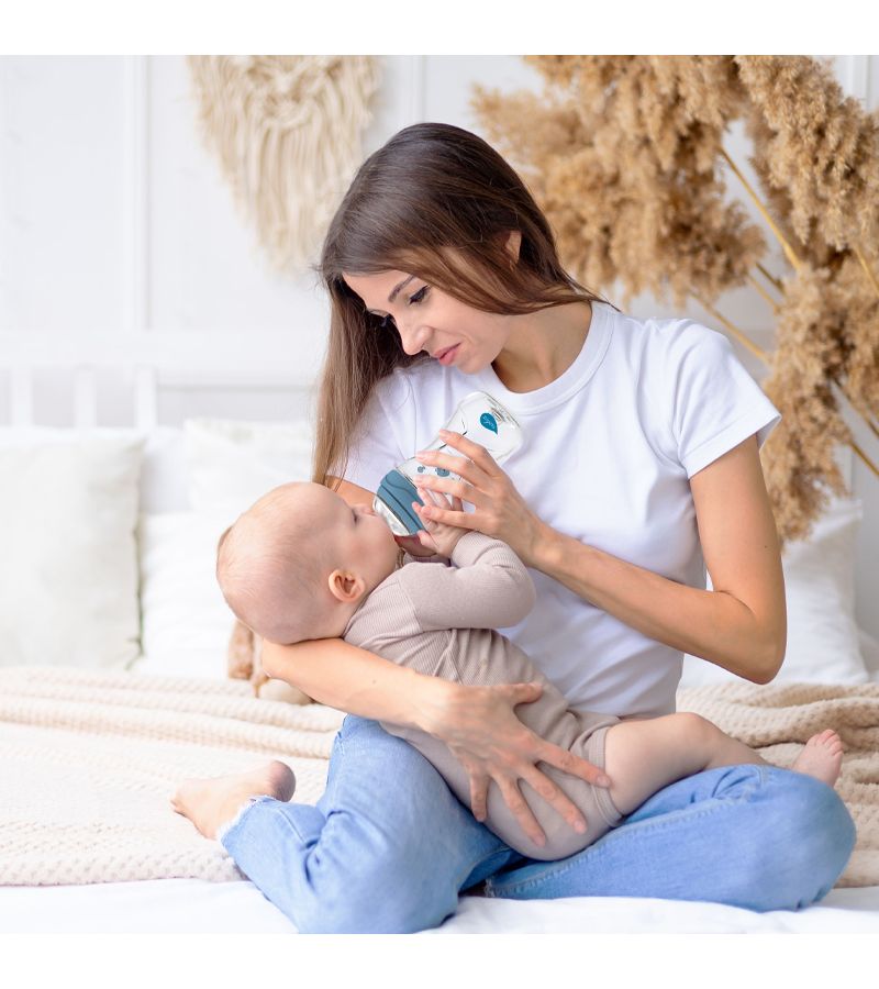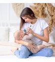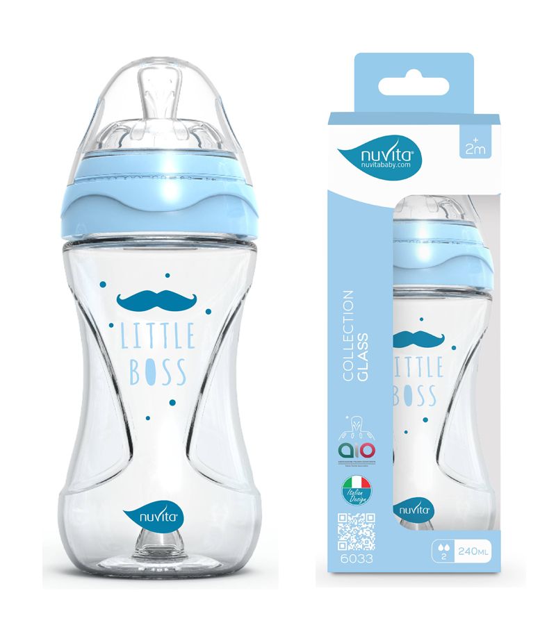 Γυάλινο μπιμπερό από την εταιρεία NUVITA κατά των κολικών με θηλή που προσομοιάζει το στήθος της μανούλας.