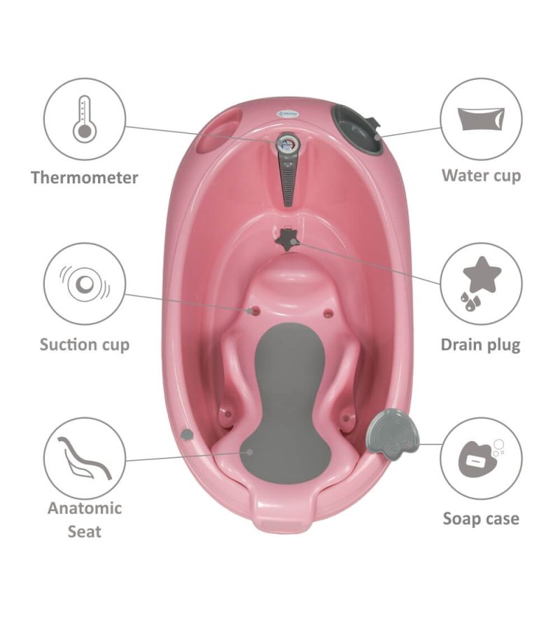 Ανθεκτικό μπανάκι κατασκευασμένο με υψηλής ποιότητας μη τοξικά υλικά με θερμόμετρο & αντιολισθητικό ανατομικό κάθισμα με βεντούζες.