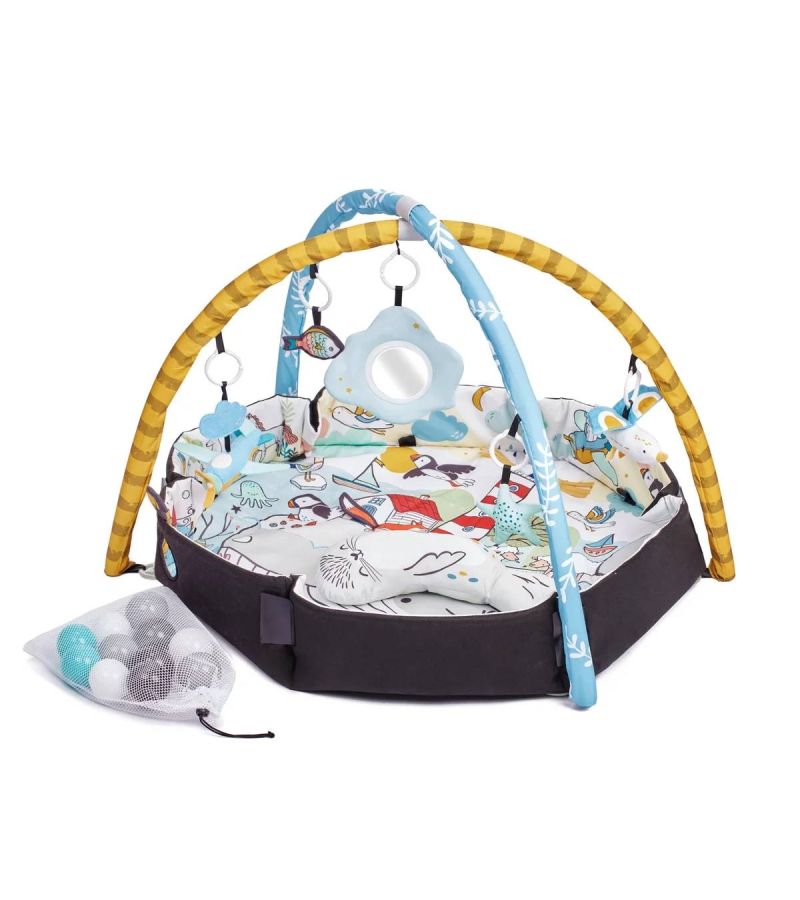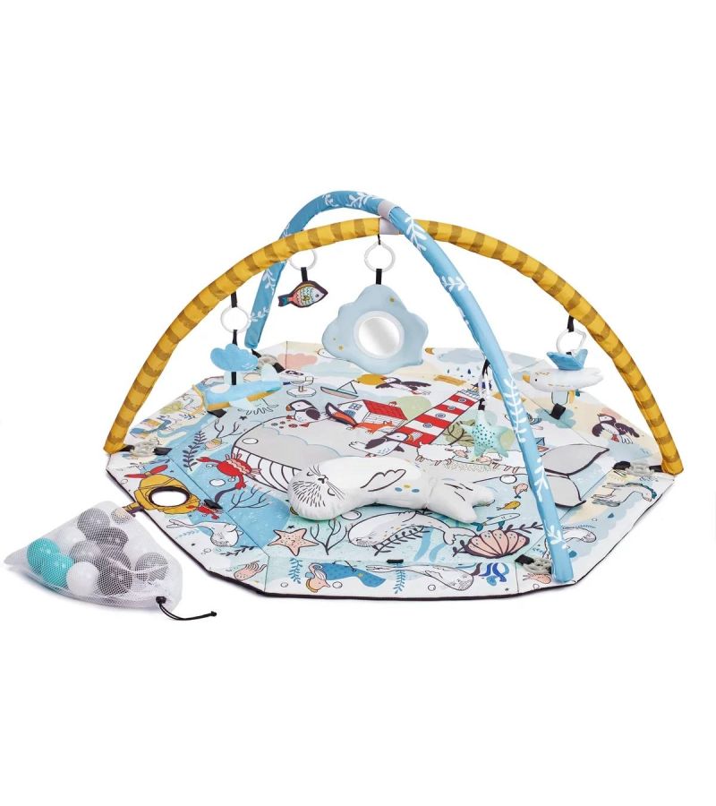 Περιλαμβάνει 5 βελούδινα παιχνίδια, 12 μπάλες και μαξιλαράκι στήριξης.