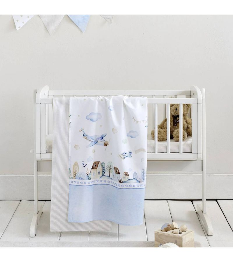 Σετ βαμβακερά σεντόνια λίκνου εξαιρετικής απαλότητας διακοσμημένο με μικρά αεροπλανάκια σε γαλάζιους χρωματικούς τόνους.
