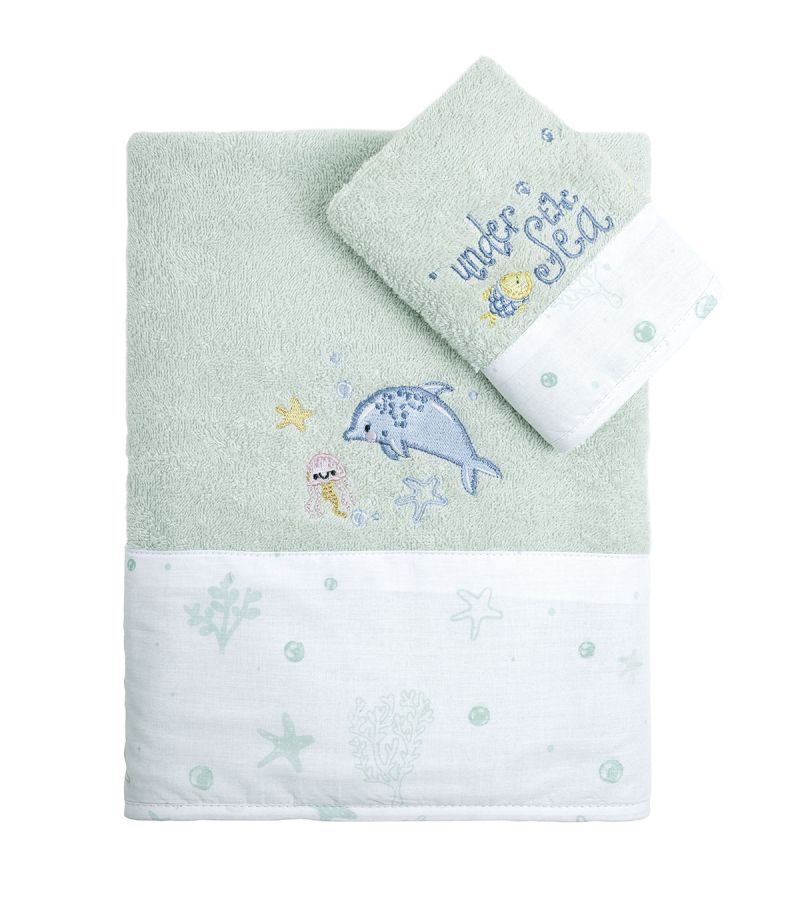 Σετ πετσέτες από 100% βαμβάκι της NIMA KIDS σε τιρκουάζ χρώμα με υπέροχο κεντητό σχέδιο.