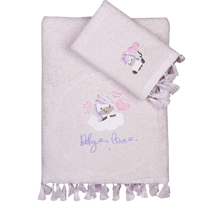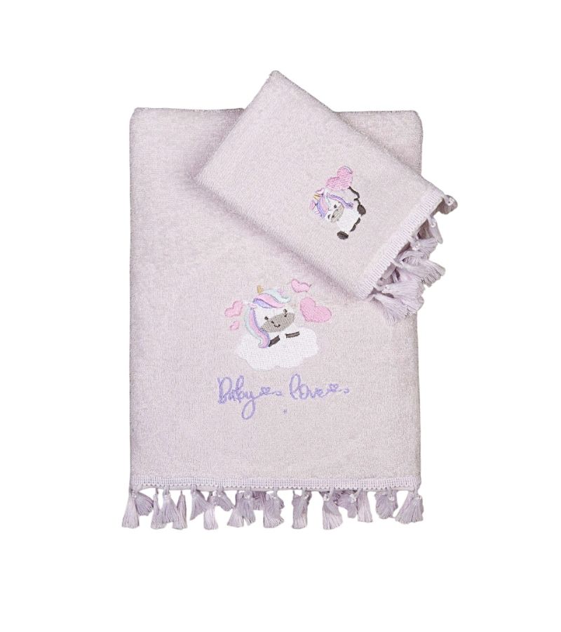 Σετ βρεφικές πετσέτες Luni Uni από 100% βαμβάκι, απαλές και υποαλλεργικές, με κεντητό μονόκερο και λιλά χρώμα, ιδανικές για απαλή και απορροφητική φροντίδα μετά το μπάνιο.