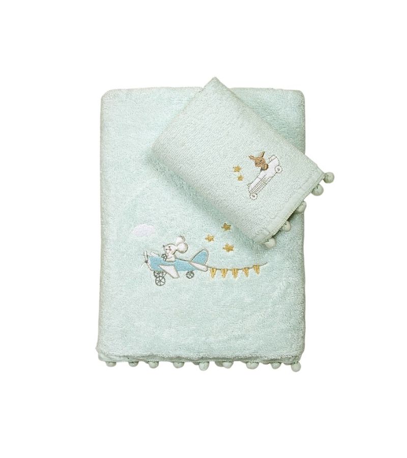 Σετ βρεφικές πετσέτες Joy Ride από 100% βαμβάκι, απαλές και υποαλλεργικές, με κεντημένο ποντικάκι σε αεροπλάνο και τιρκουάζ βάση, ιδανικές για απαλή και απορροφητική φροντίδα μετά το μπάνιο.