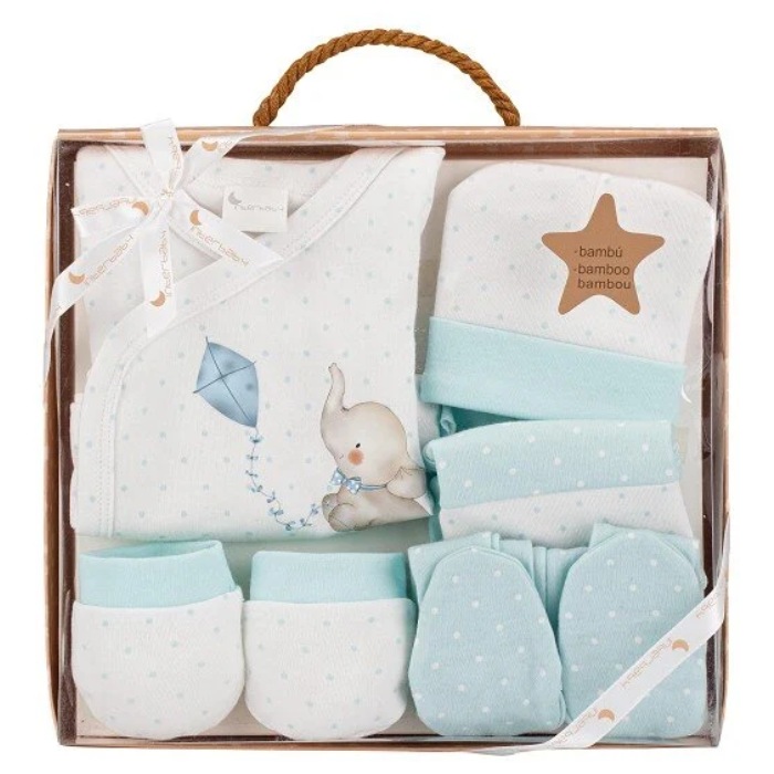 Σετ δώρου για νεογέννητο από 100% οικολογικό βαμβάκι, περιλαμβάνει καπέλο, γάντια, σαλιάρα, μπλούζα και παντελονάκι με κλειστά πόδια.