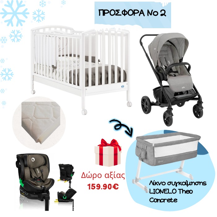Ολοκληρωμένο σετ βρεφικού εξοπλισμού που καλύπτει τις βασικές ανάγκες του μωρού από την πρώτη κιόλας μέρα. Περιλαμβάνει βρεφικό κρεβατάκι Pali Ciak με στρώμα, καρότσι Joie Chrome Peddle για άνετες και ασφαλείς μετακινήσεις, καθώς και κάθισμα αυτοκινήτου LIONELO Harmony, με δώρο λίκνο για επιπλέον άνεση και πρακτικότητα στο σπίτι.