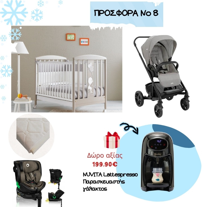 Ολοκληρωμένο σετ βρεφικού εξοπλισμού που καλύπτει πλήρως τις ανάγκες του μωρού από την πρώτη κιόλας μέρα. Περιλαμβάνει βρεφικό κρεβατάκι Pali Orsetto με στρώμα, καρότσι Joie Chrome Peddleγια άνετες και ασφαλείς μετακινήσεις, καθώς και κάθισμα αυτοκινήτου Lionelo Harmony. Το σετ συνοδεύεται από δώρο παρασκευαστή γάλακτος NUVITA, προσφέροντας πρακτικότητα και ευκολία στην καθημερινή φροντίδα του μωρού.