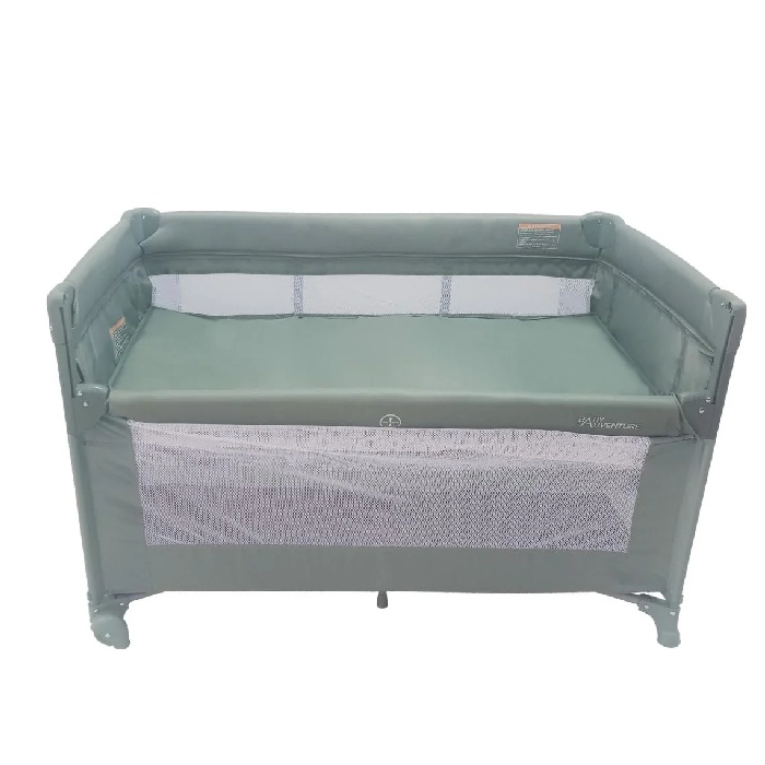 Παρκοκρέβατο 2 επιπέδων σε απόχρωση Khaki με ανοιγόμενη πλαϊνή πλευρά, ιδανικό για ύπνο και παιχνίδι από τους πρώτους μήνες ζωής.