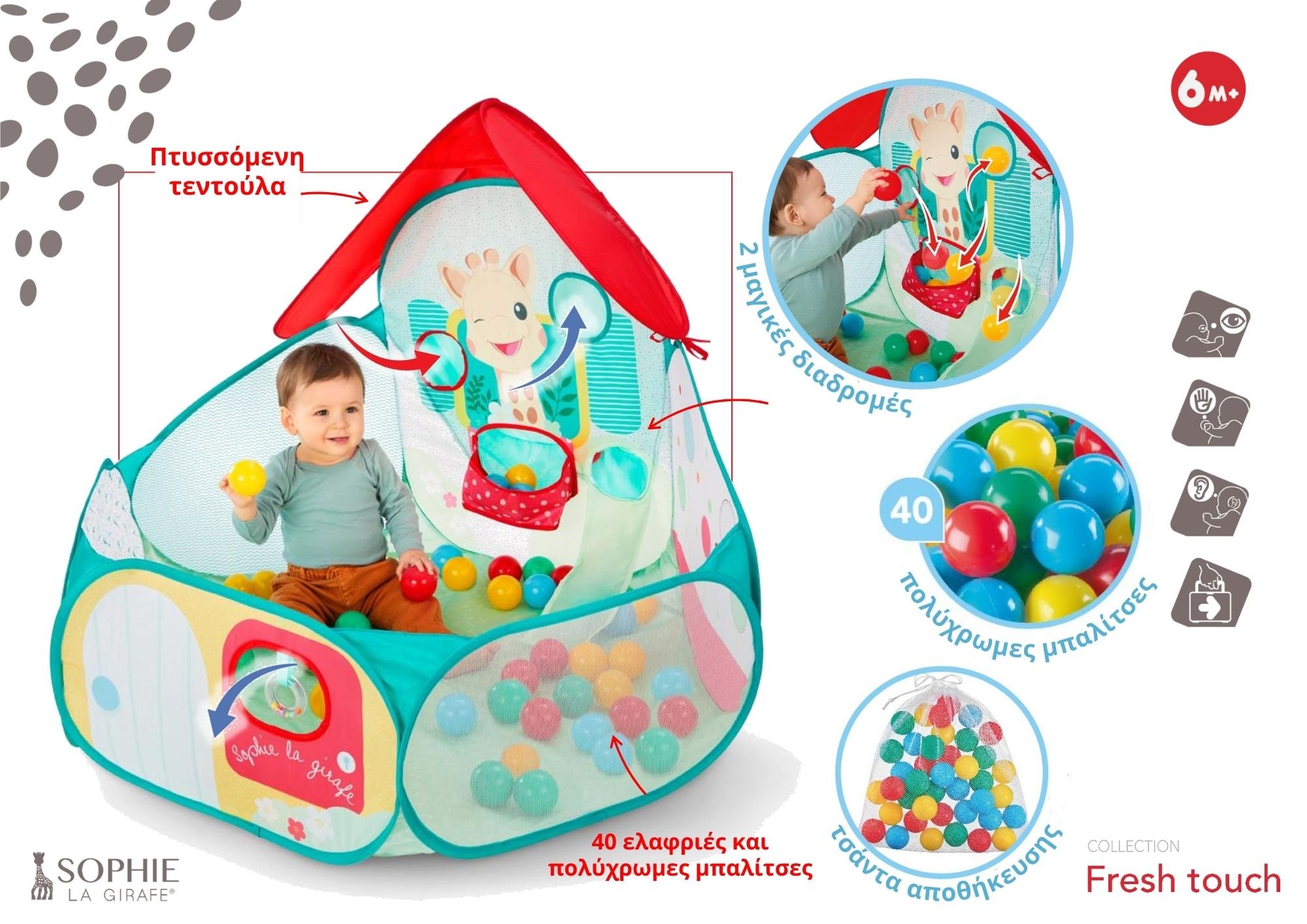 Ειδικές οπές στόχοι για να βάζουν τα παιδιά τις μπαλίτσες – εξασκώντας στόχο και συντονισμό Χαριτωμένο σχέδιο με την αγαπημένη Σόφι και τέντα για "σπιτάκι" που προστατεύει και ενθουσιάζει